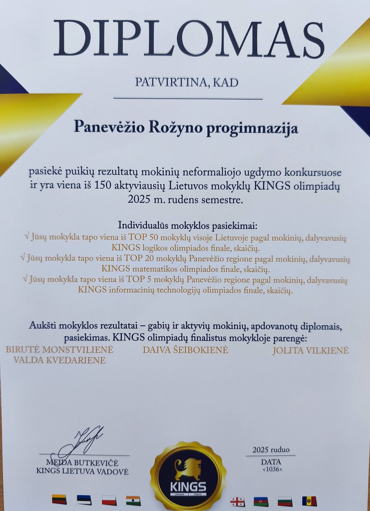 Tarptautinės olimpiados "Kings" organizatoriai dėkoja, kad Rožyno progimnazija bendradarbiauja ir prisideda prie mokinius motyvuojančios aplinkos kūrimo bei skatina jų papildomą domėjimąsi mokomaisiais dalykais. 2025 m. rudens semestre puikius rezultatus konkursuose pademonstravo