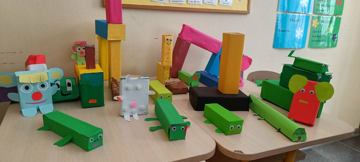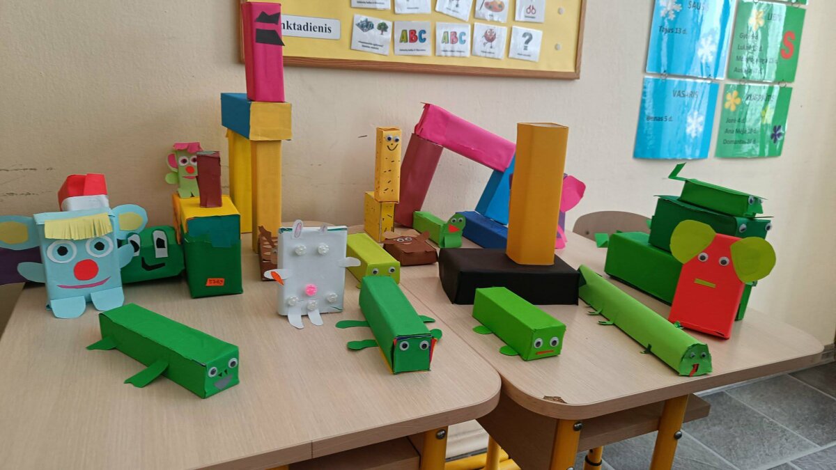 Na, o technologijų pamokoje, atliko Ekonovus skirtą užduotį – iš popierinių pakuočių sukurti kūrybinį darbelį. Smagu buvo matyti, kaip nebereikalingos pakuotės atgimsta traukinukais, krokodilais, drambliukais, žirafomis ir t.t..